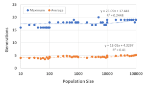 Figure 3: Using my own population modeling software, I was able to estimate the average lifespan of any new, neutral mutation. I ran each population size model 1,000 times and took an average (orange dots). Since most new alleles are lost to genetic drift very quickly, the size of the population is almost irrelevant. In the video, I say “4” generations, but I said that before I had finished all the models runs. I think “5” is a better estimate. It takes, on average, 5 generations for any new mutation to be lost (btw, this also applies to beneficial mutations, as Sanford has shown in his work with Mendel).