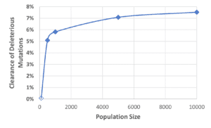Figure 2: Using Mendel’s Accountant and summarizing over many runs, we can see that the separation between the blue and red lines in Figure 1 is negligible (less than 8% in populations of 10,000 individuals). The size of the population does not appreciably affect the mutation accumulation rate.